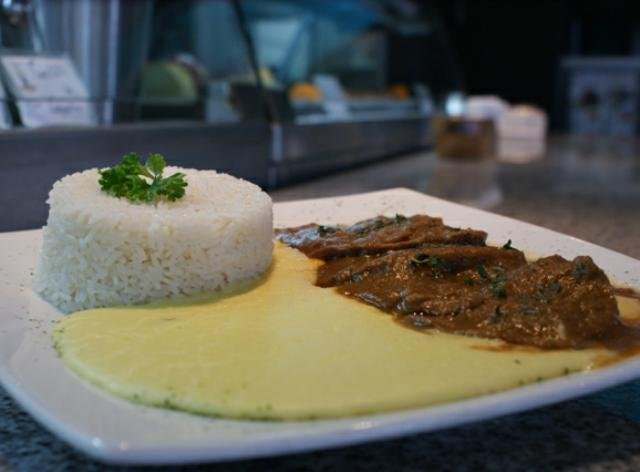 Roasted veal in a beef gravy served with very thin mashed potatoes and rice.
