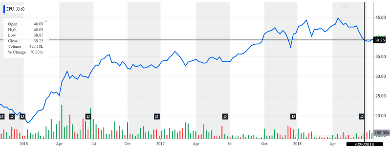 But you get the idea. It’s a convenient way to put your money on Peru. Ticker symbol EPU, cashtag $EPU. Below is how it has performed since I bought it in September 2016.