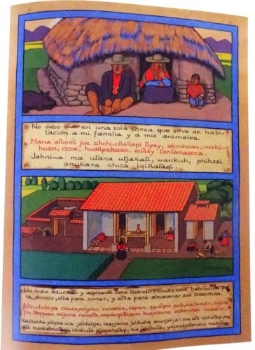 (Below) “Let’s make paved roads! Let’s pool our money and buy a truck for the Ayllu. Let’s happily obey the Road Law!”