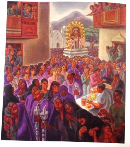My personal favorite, an interpretation of the Señor de los Milagros procession. Note Cerro San Cristobal in the background.