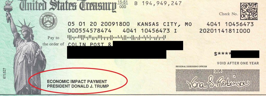 One of the curiosities expats get used to in Latin America is the shameless personalization of government resources, or as Quico Toro gives as example, “the billboards trumpeting the name of every Podunk politician who ever filled in a pothole anywhere in the country.” There are various examples, but nothing “trumps” (hehe) putting your name on checks from the treasury.