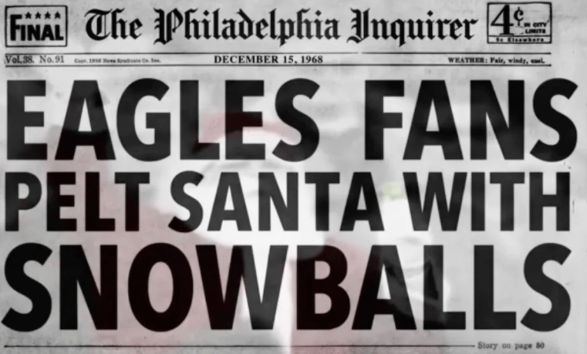 Their infamy goes back to before I was born. In 1968, Eagles fans bombarded Santa Claus with snowballs amid a disastrous season. The consensus among Philly natives is that the media doesn’t tell the whole story: that this particular Santa deserved it.