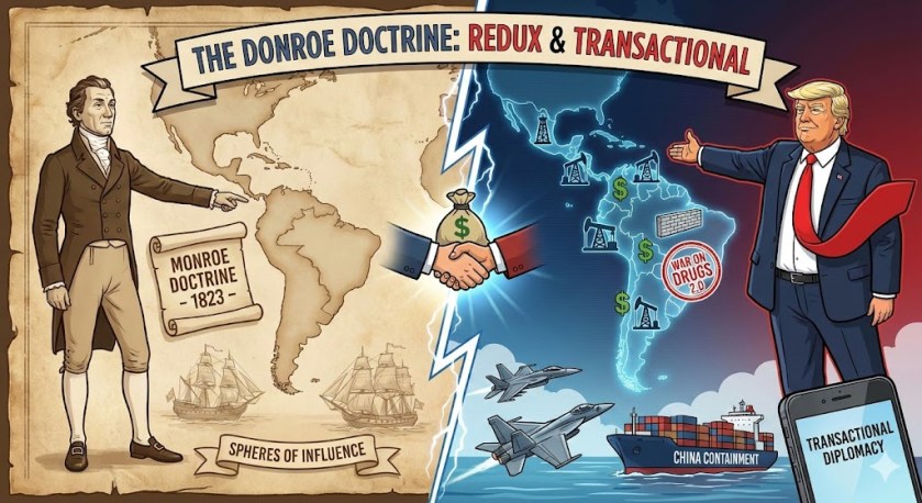 What exactly is Trump’s addition to the Monroe Doctrine? Most importantly, it is the resurrection of it. But it also looks like he’s extorting the new Venezuelan government for about $3 billion in oil. That and other actions in the region comprise something new.